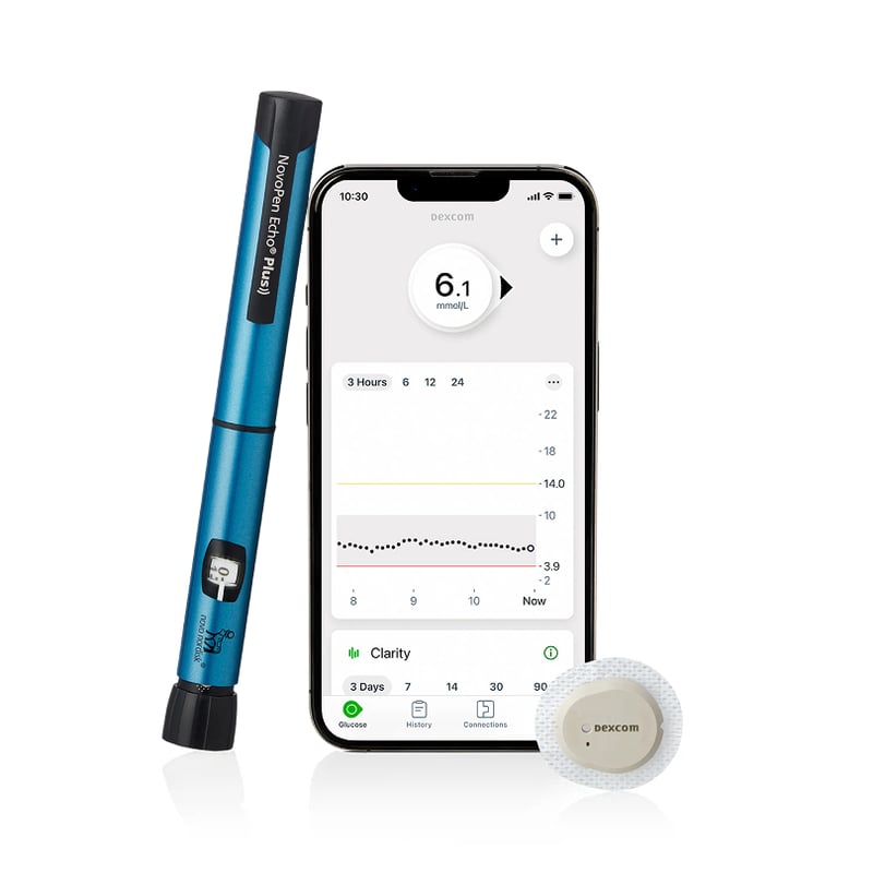 Med Dexcom G7 och NovoPen® 6 eller NovoPen Echo® Plus får du en omfattande bild*¹ av dina glukos- och insulindata, vilket underlättar din dagliga diabeteshantering.